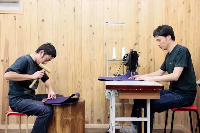 捶打會(huì)由比較資淺的工匠在一個(gè)圓木樁上進(jìn)行。敲出折角后,再交給資深的前輩進(jìn)行縫紉。據(jù)說,他們家工匠隨著制作帆布袋技術(shù)的提升,從圓木樁走到縫紉機(jī)這個(gè)面對(duì)面的距離,所需要的時(shí)間是 7-8 年。