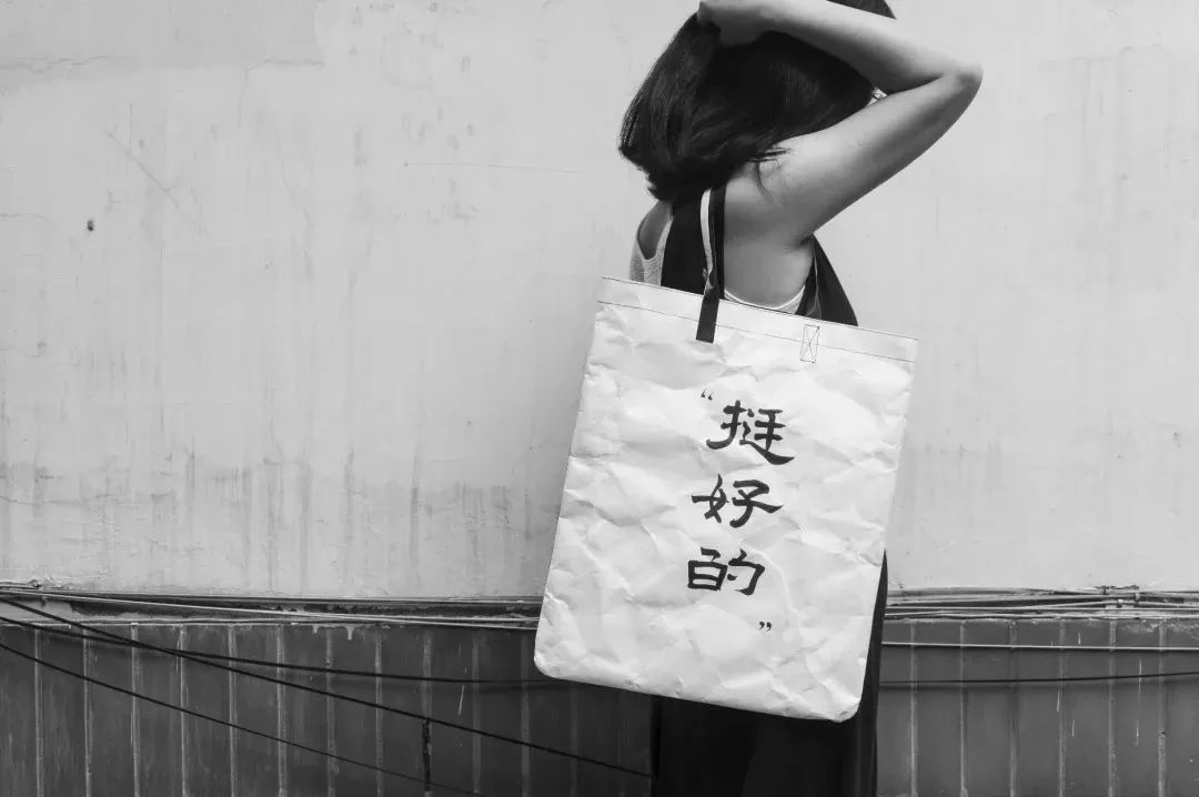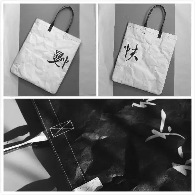 Tyvek? 特殊的紙感讓設計師聯想到了文字。為了充分體現漢字的魅力,并呼應Tyvek? 的紙質特性,所有文字和圖樣均由設計師手寫并掃描而成,保留了書法墨跡在宣紙上的獨特效果。整個系列的文字內容選擇了三組反義詞和三組潛臺詞,兼具嚴肅與詼諧,為不同人群需求提供豐富的選擇。
