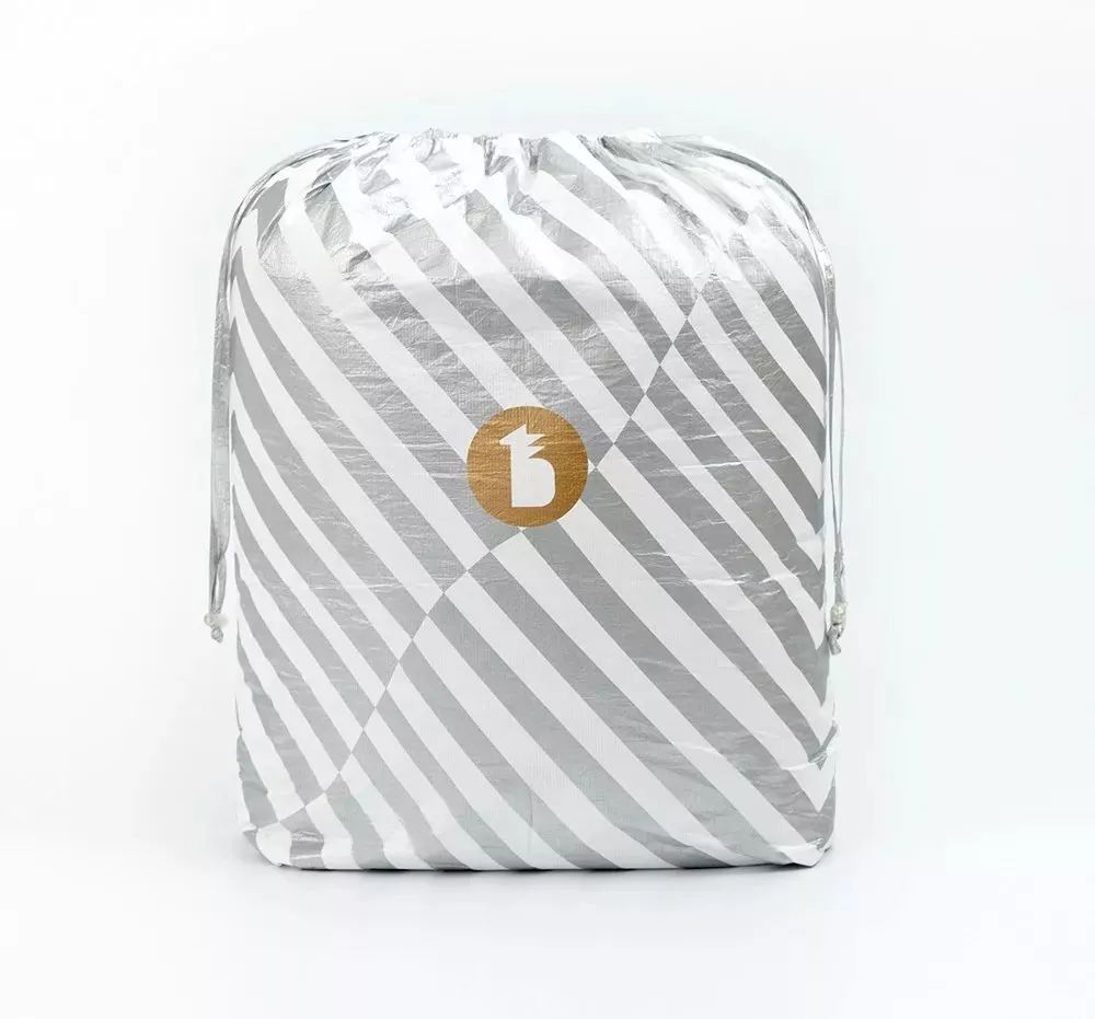 Tyvek? 材料比紙張更輕盈,卻堅韌有質感,光滑不掉屑,用做床上用品的包裝,可以很好地阻隔外界灰塵,確保使用者的健康。菠蘿斑馬床上亞麻四件套包裝袋在Tyvek? 上印上金色Logo,再配上銀色條紋,彰顯大氣。